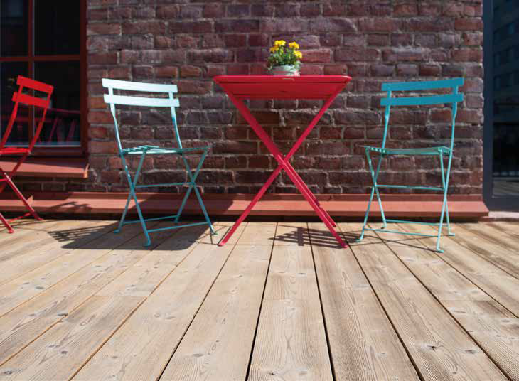 Świerk w wersji thermo – pozbawiony żywicy, stabilny i lepiej izolujący. Jasnokremowy kolor oraz drobne sęki wpisują się w skandynawską estetykę, a brak potrzeby dodatkowej konserwacji upraszcza pielęgnację tarasu.
